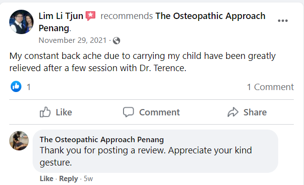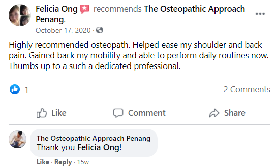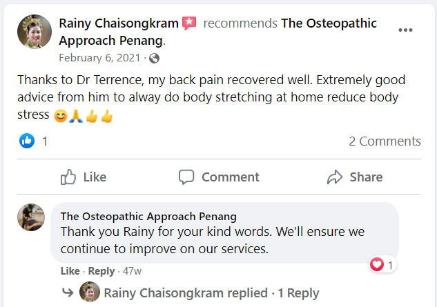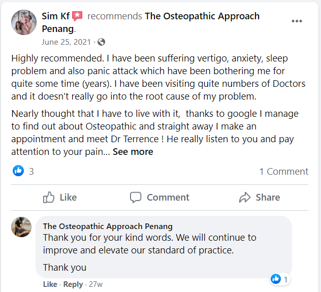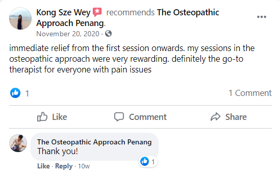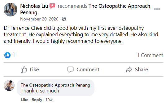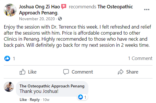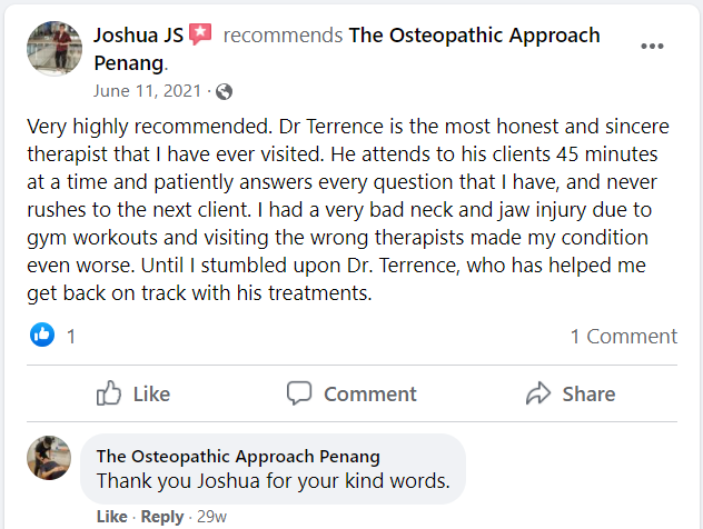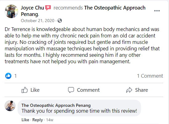 "Dr Terrence Chee did a good job with my first ever osteopathy treatment. He explained everything to me very detailed."