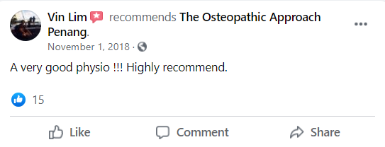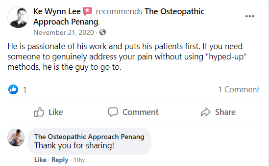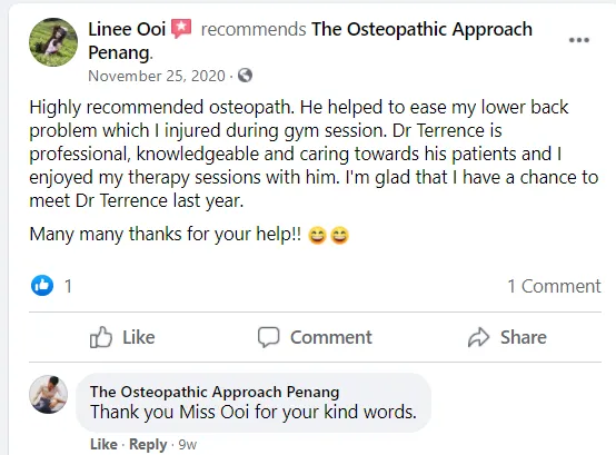 "As a fitness professional, the body is my income and I treasure the body even more, and Dr Terrence is my go to Dr whom have helped me recover from my hip and calve strain! He does Penang consultations too ya! 🙂"