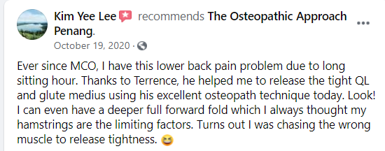 "Thanks to Terrence, he helped me to release the tight QL and glute medius using his excellent osteopath technique today. "